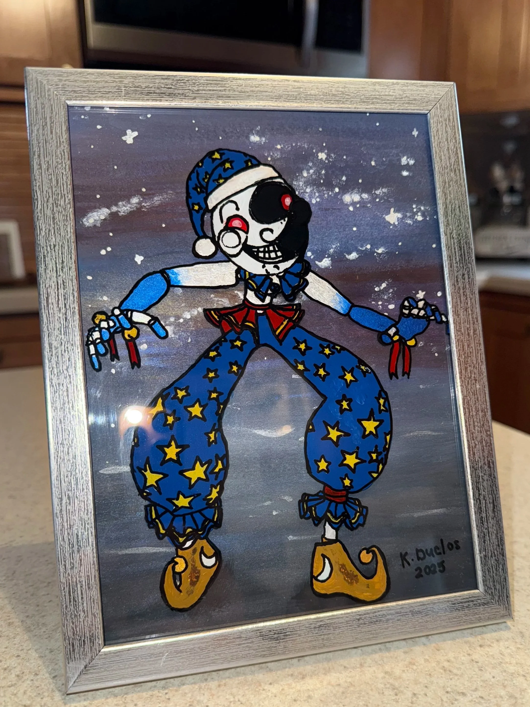 Inspired by Moondrop from Five Nights at Freddy’s, this piece marked a shift for me. It was less about survival and more about patience. I experimented with fine line work, color shifting paint, and some glow in the dark details (not all of the experiments worked according to plan, which is why the Moon Guy lives on my wall).