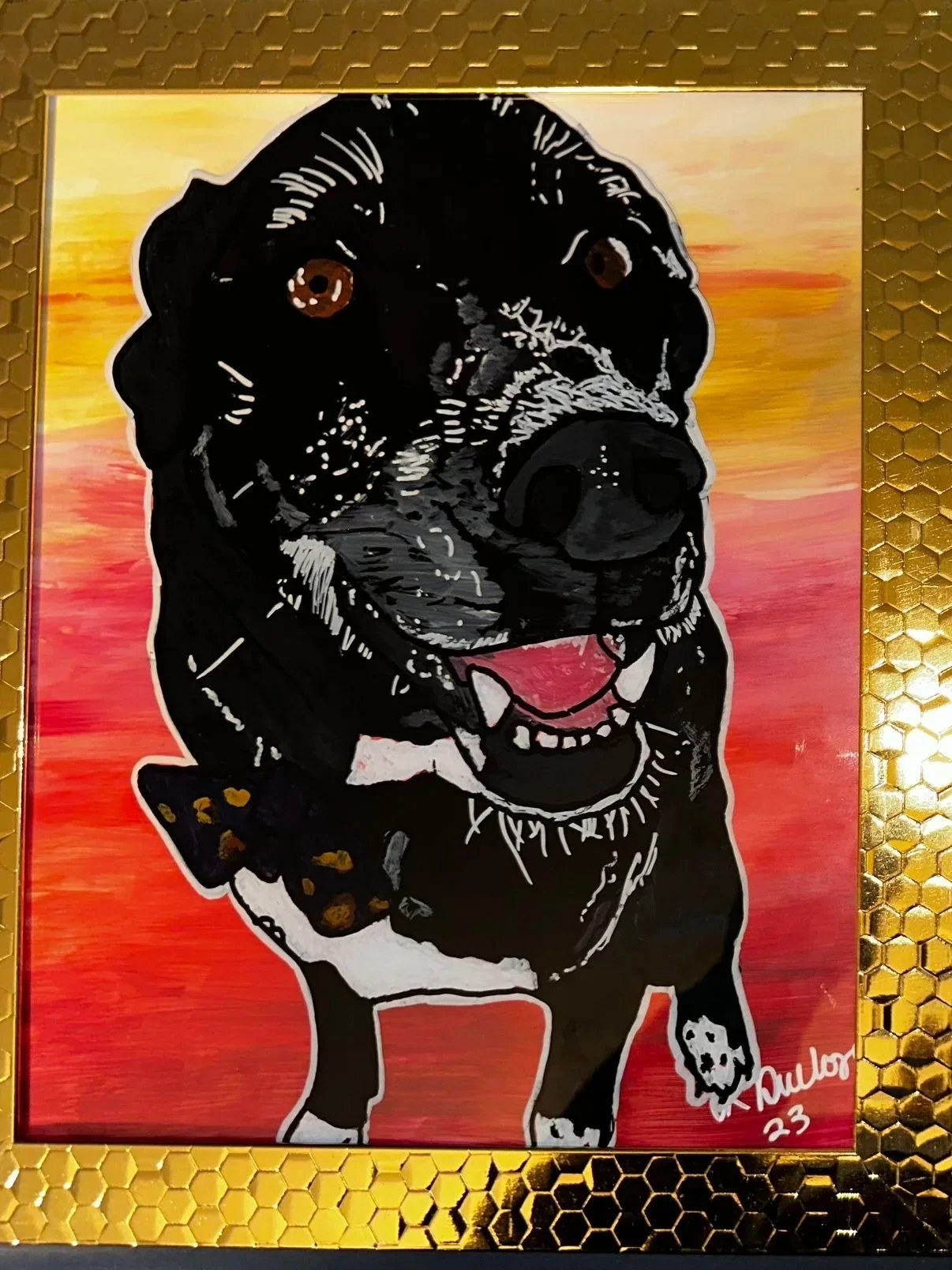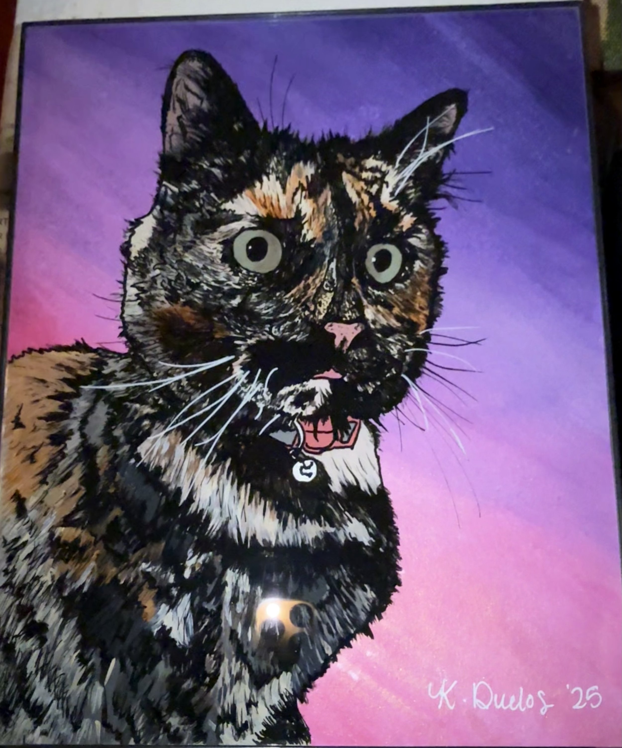This was my first deeply detailed pet portrait. Every layer painted in reverse, every strand of fur intentional, the little bit of her tongue sticking out. I focused on capturing her expression exactly as she was… alert, curious, and full of personality. The soft pink and violet background features color shifting shimmer that almost make it feel like it’s glowing. I didn’t want this piece to feel heavy, I wanted it to feel like peace and light, like the kind of love that doesn’t disappear.