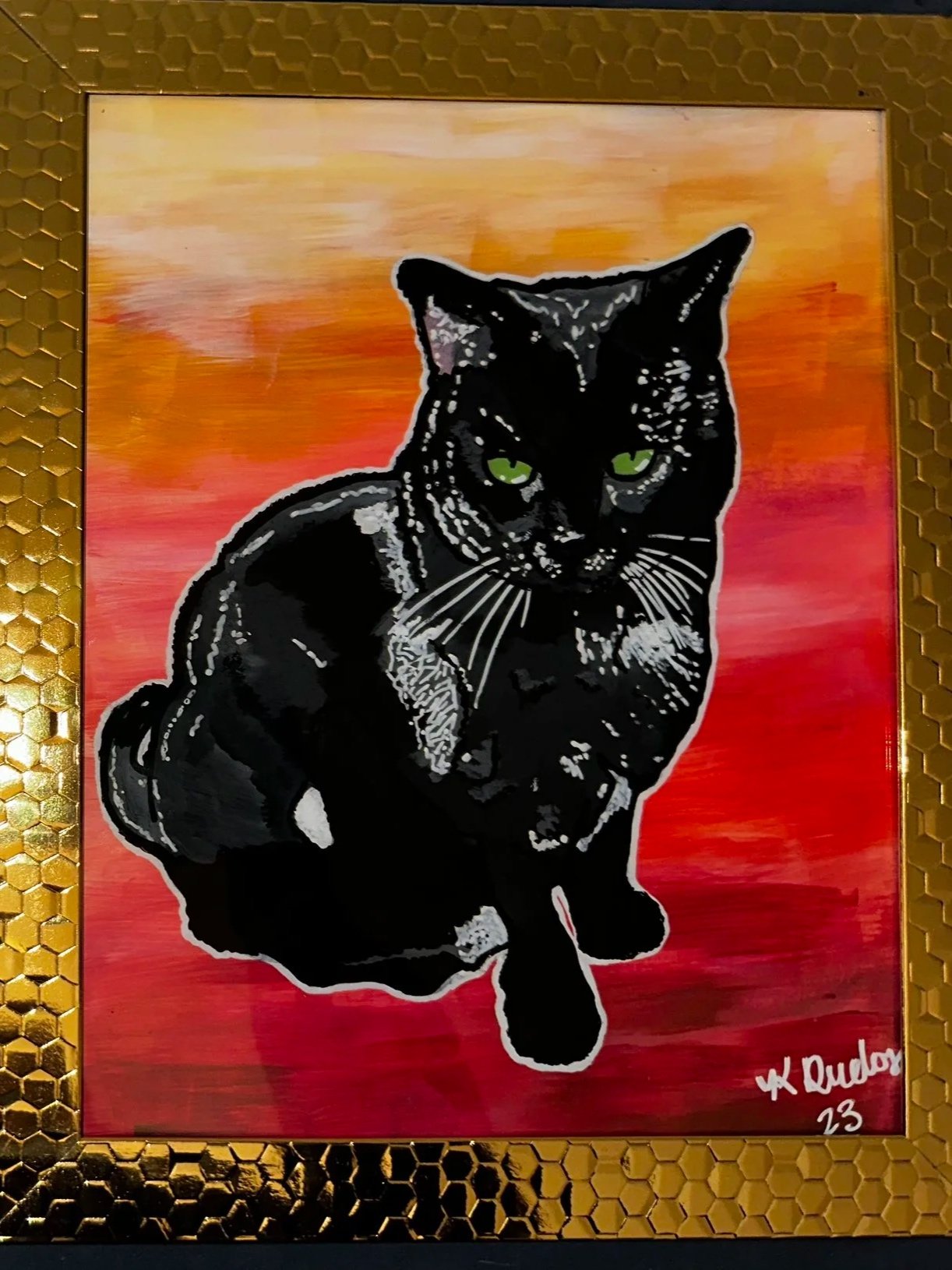 This piece continued my exploration of reverse glass art, with a deeper focus on texture and detail that captured the scales, posture and personality of a beloved pet.