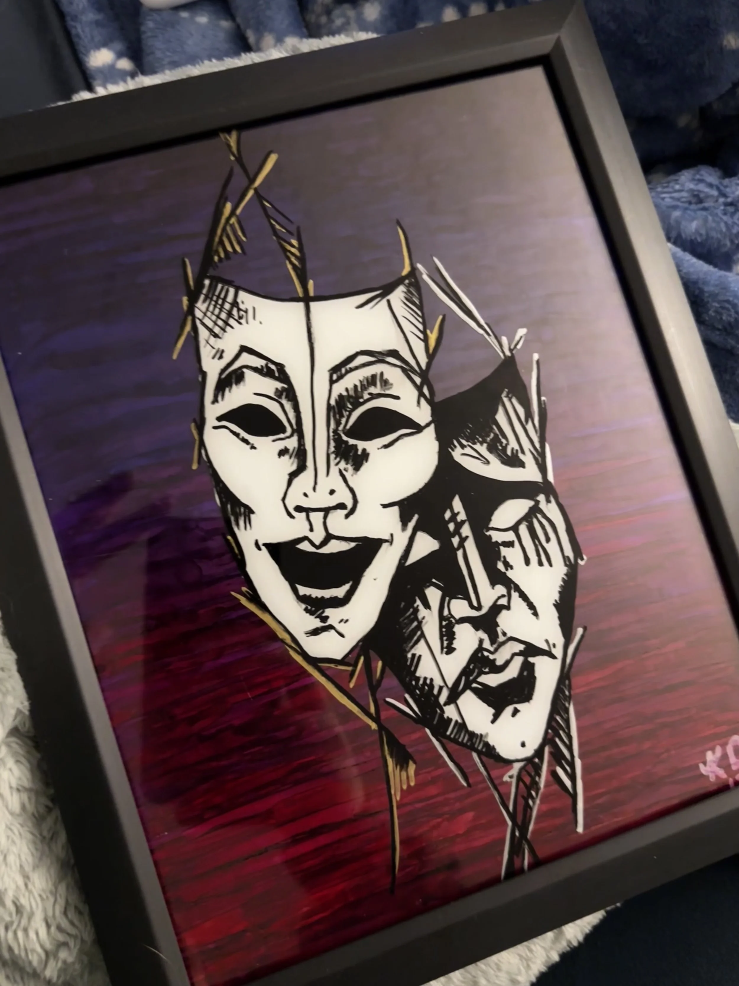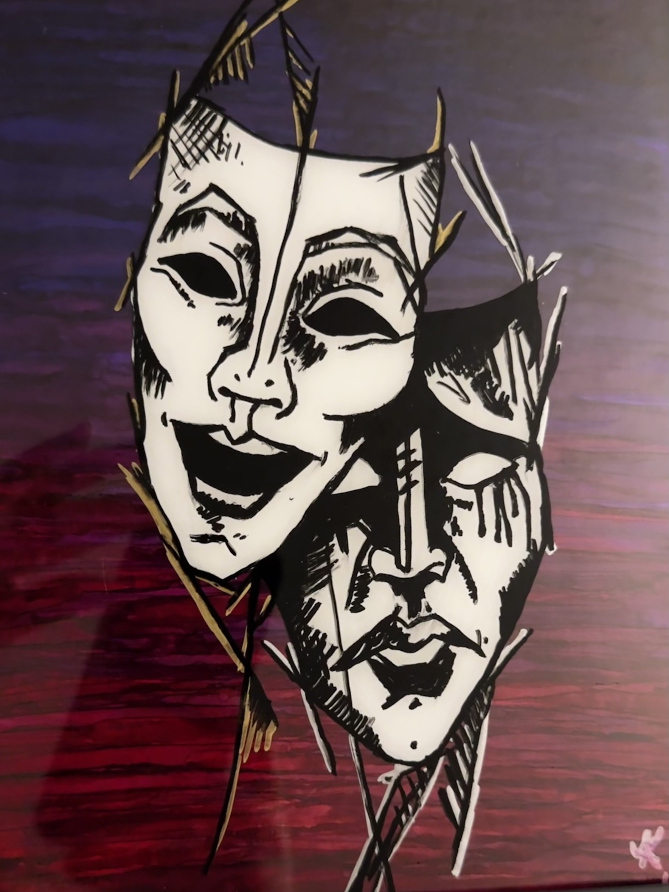Created as a gift for someone deeply connected to theater and performance, this piece explores contrast and identity through a split mask composition. Inspired by stage symbolism, the two faces reflect opposing emotional states… light and shadow, presence and concealment, comedy and tragedy.
